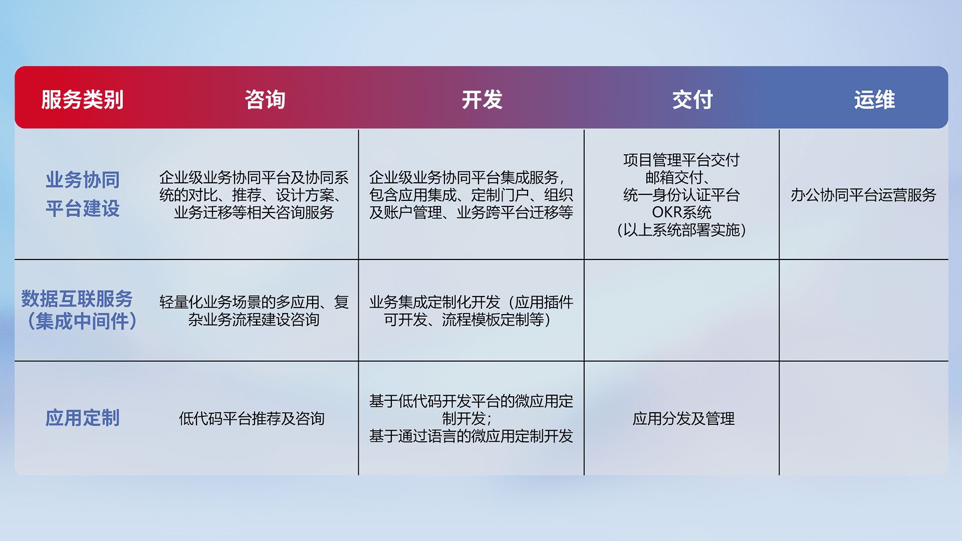 针对钉钉、、企微、、IDaas等平台级产品提供产品的规划、、、方案、、、交付、、、定制化开发等服务,,,,实现如统一协同办公、、智能客户服务、、、混合会议管理、、、智能数据查询、、等业务场景,,,,实现数字化转型。。。